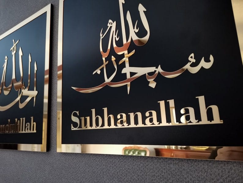 Elegant 3-piece Islamic wall art set featuring Subhanallah, Alhamdulillah, and Allahu Akbar. Made with premium MDF wood and gold/silver mirror acrylic, 100% handmade with laser-cut precision. Lightweight, easy to hang, and perfect for living rooms, prayer corners, or offices. Ideal gift for Ramadan, Eid, weddings, or housewarmings. Available in 12", 16", and 20" sizes.